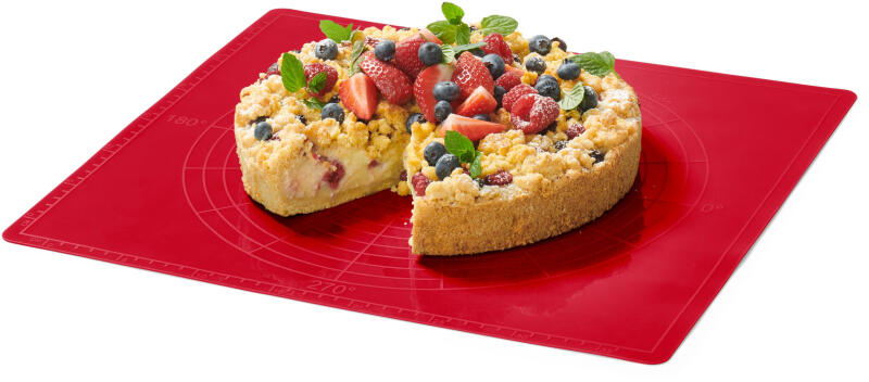 Többször felhasználható sütőlap Szín: Piros Anyag: 100% szilikon Méretek: Kb. 42 x 38 cm, anyagvastagság: kb. 1 mm Igény szerint méretre vágható átmérők: 12,5 cm / 15 cm / 17,5 cm / 20 cm / 22,5 cm / 25 cm / 27,5 cm / 30 cm / 32,5 cm Tartalom: Szilikongyűrűvel a helytakarékos tároláshoz Súly: Kb. 190 g Figyelmeztetések: Figyelem! Ne tegye a sütő aljára! Sütőpapír helyett és munkafelületkéntSzilikonból – tapadásmentes és nem csúszikIdeális munkafelületként – cm-es skálabeosztással, átmérő- és tortaszelet-jelölésekkelIgény szerinti méretre vágható – sütőformák kibélelésére is használhatóSzilikongyűrűvel a helytakarékos tároláshozMosogatógépben tisztíthatóEz a többször felhasználható szilikon sütőlap csökkenti a hulladék mennyiségét.